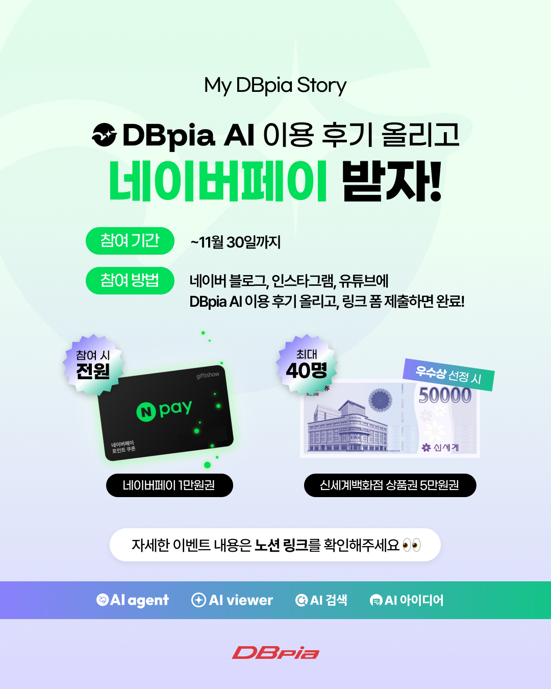 ※ DBpia AI를 잘 소개해준 우수 참여자에게는 더 큰 보상이 기다리고 있어요!