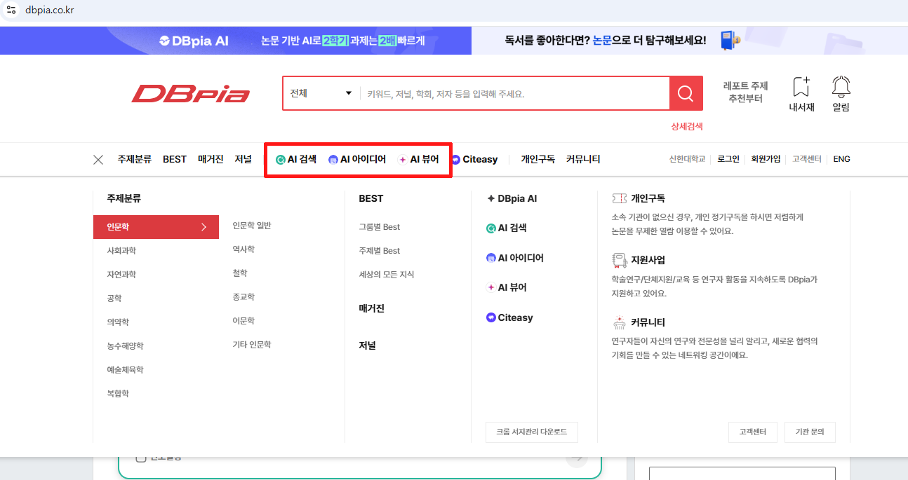 중앙도서관에서는 구성원의 학습과 학술연구 지원을 위해 신규 도입된 DBpia AI 서비스를 한시적으로 제공하고 있습니다.