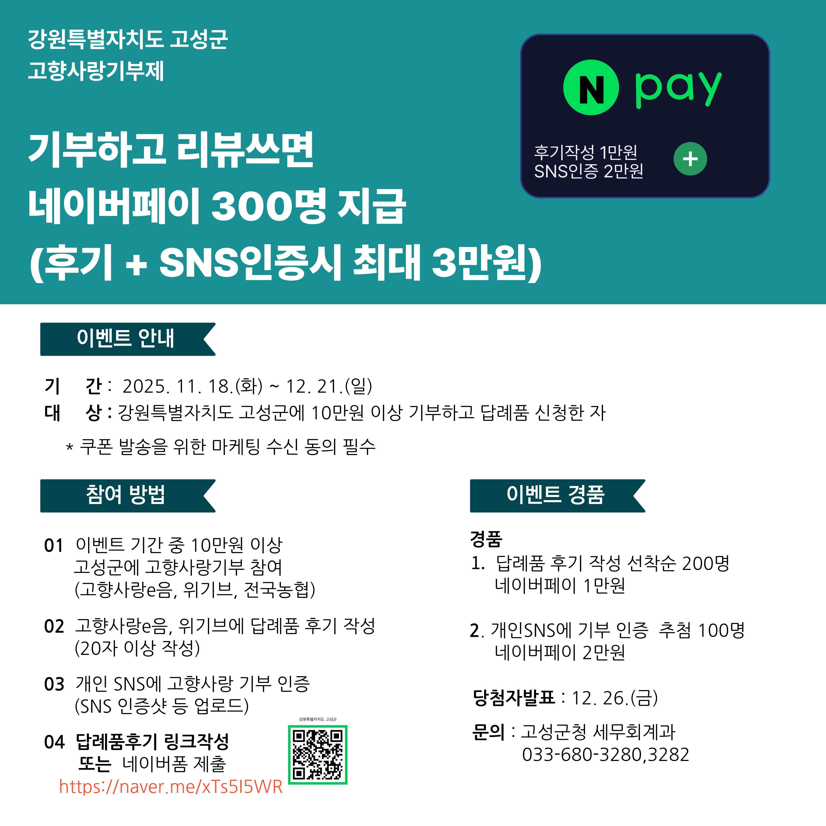 「고성군 고향사랑기부제 답례품 후기, 리뷰 이벤트」 안내
