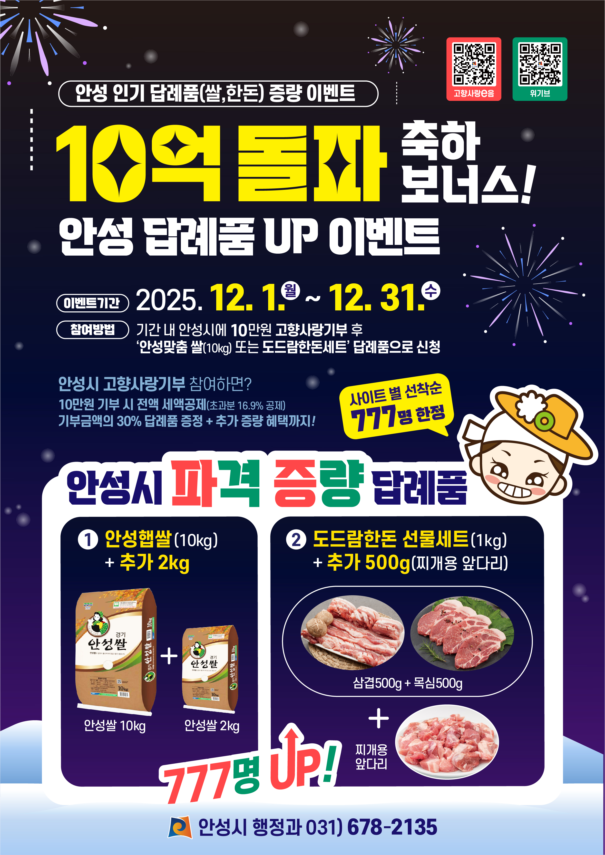10억돌파 축하보너스! 안성 답례품 UP 이벤트 홍보