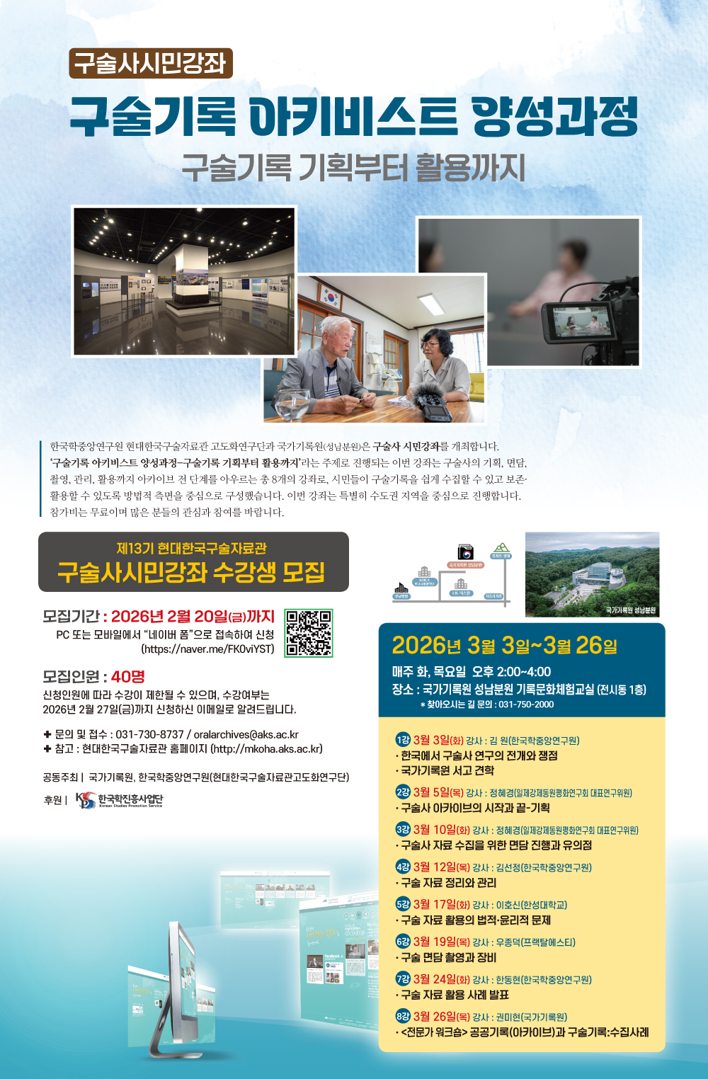 구술사 시민강좌 "구술기록 기획부터 활용까지" 개최 안내