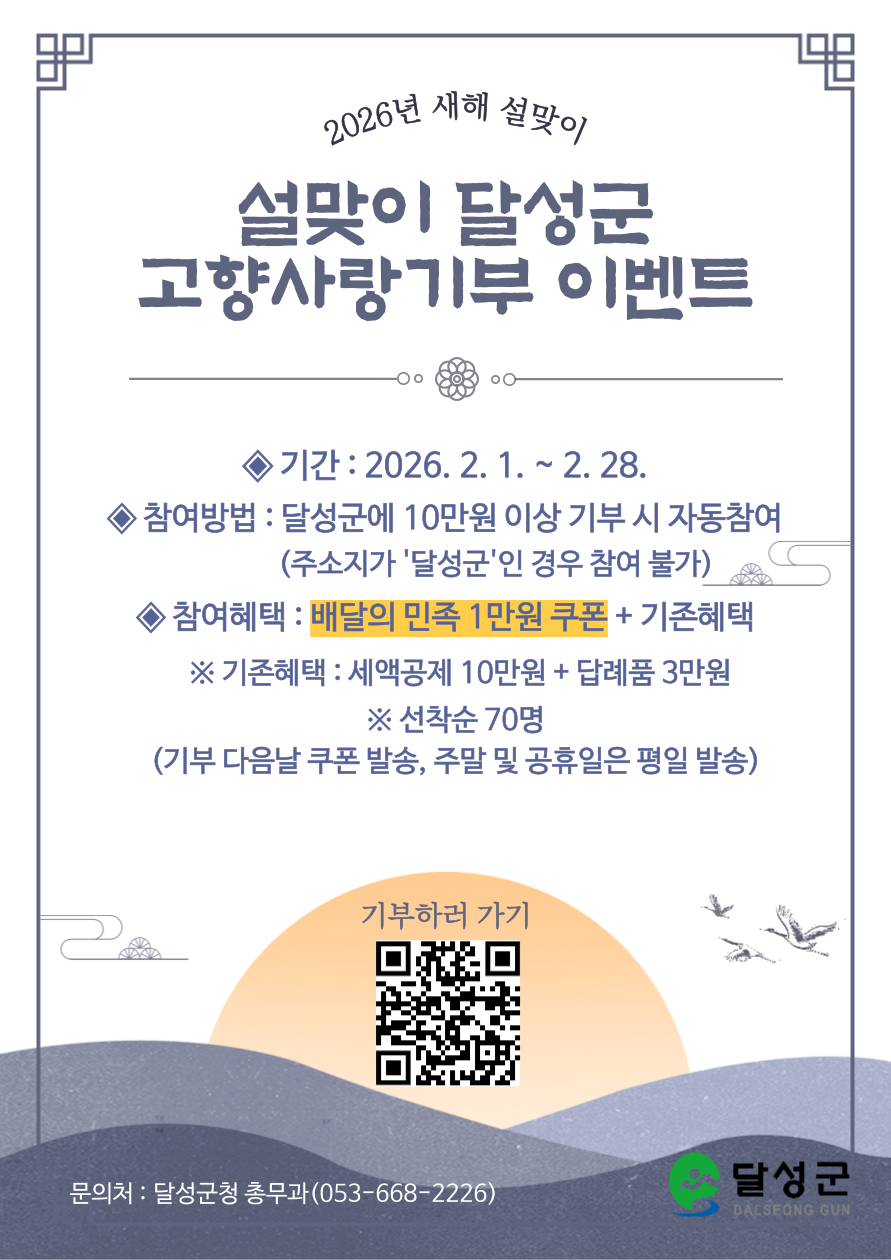 『달성군 설맞이 고향사랑기부제 이벤트』참여 안내 및 홍보