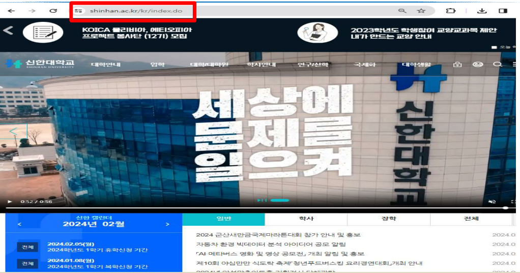 1. 신한대학교 홈페이지 접속: www.shinhan.ac.kr