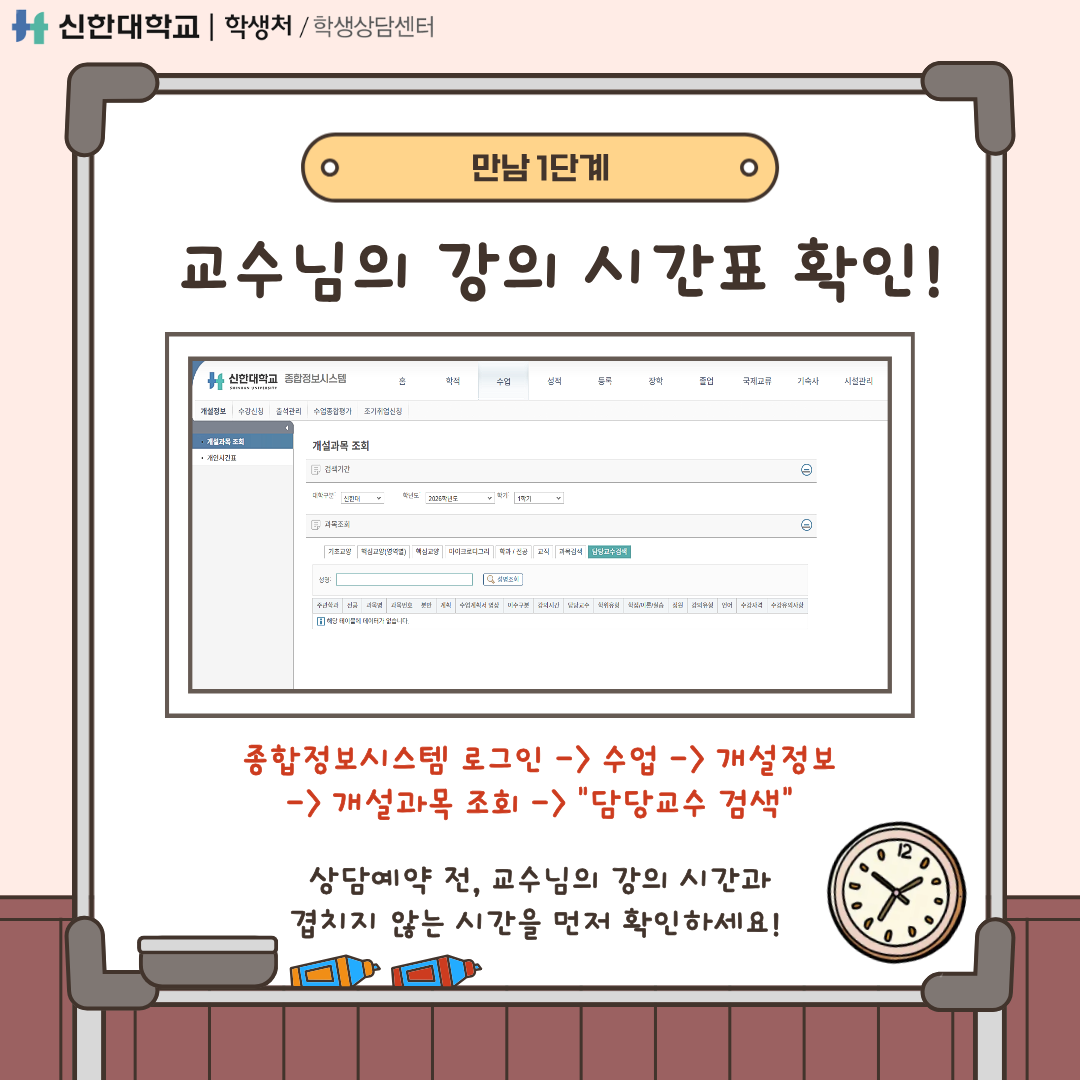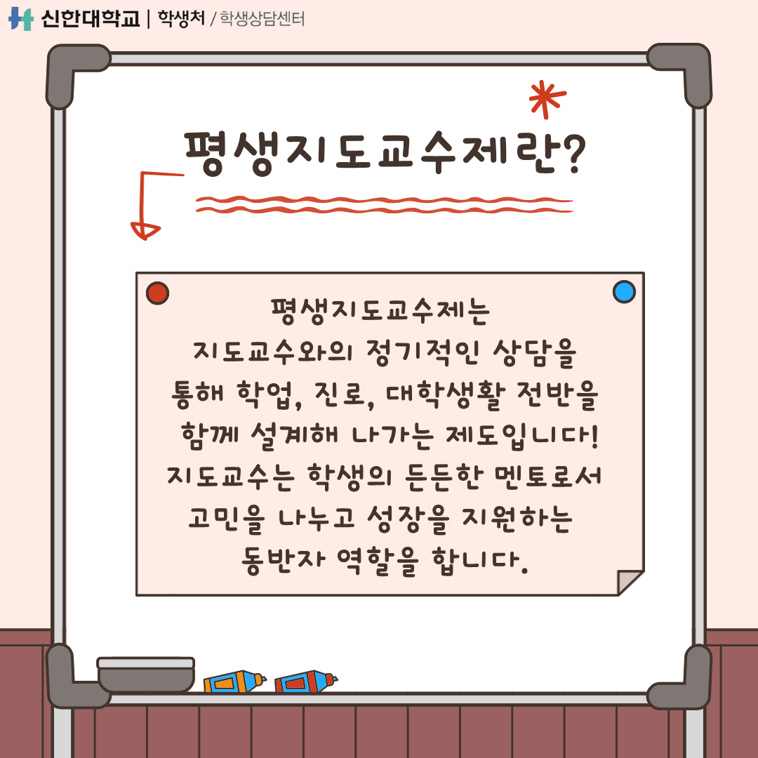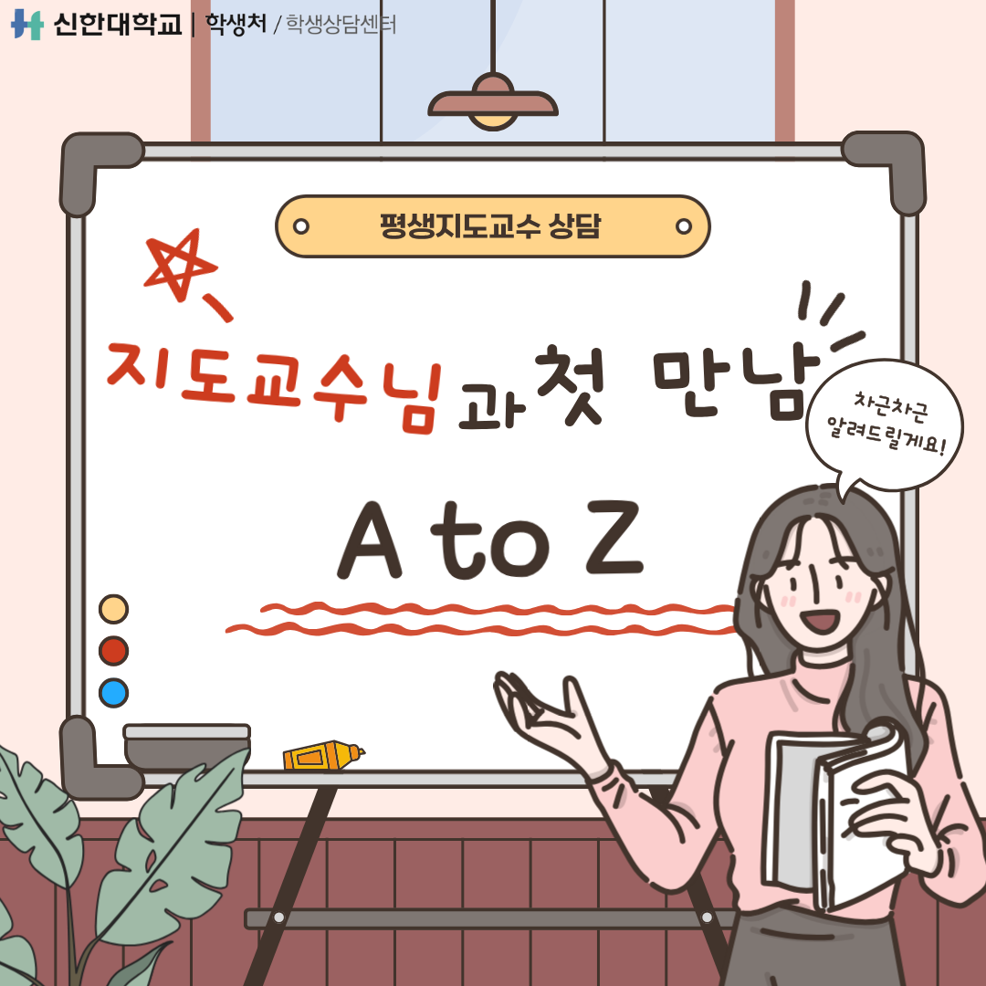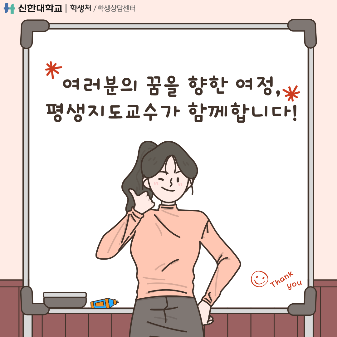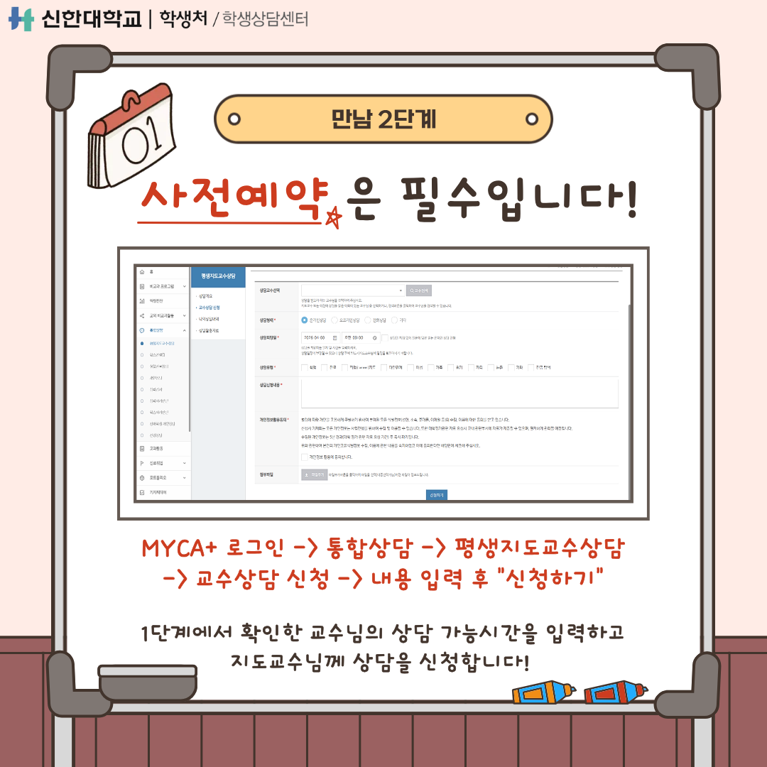 신한대학교 학생 여러분께 평생지도교수 학생상담예약 가이드를 통해 지도교수님과의 상담예약 방법을 안내해드립니다:)